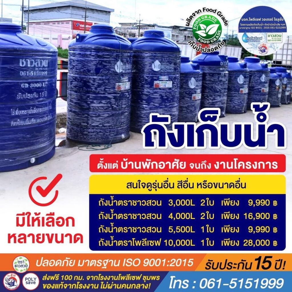 | ถังน้ำตราโพลีเซฟ | 10,000L (ใบละ) | 28,000฿ |